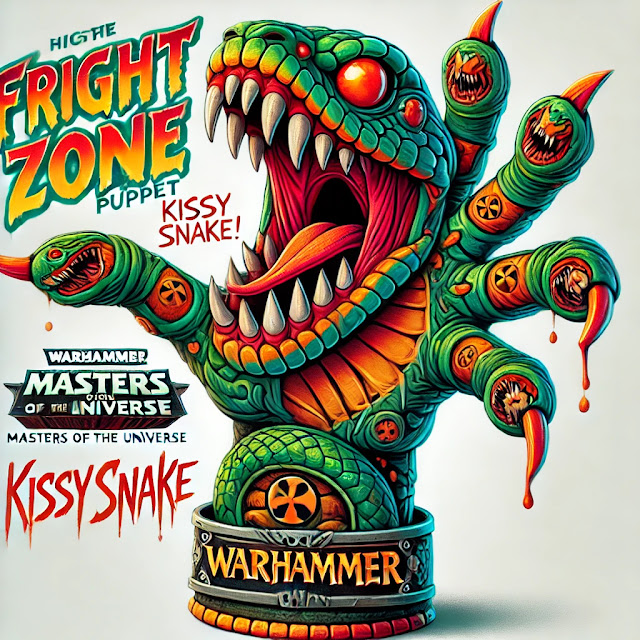 Narrative Tie: No death is final for the damned, and the Champion of Khorne is proof of this cursed truth. Even when pierced by spear or blade, Black Vasken refuses to fall. The last warlord of Grayskull, he stalks the blasted ruins of time — a horned revenant clad in shattered armor. But Vasken doesn’t ride alone. Strapped to his gauntlet is Kissy Snake — a warp-puppet stitched from chaos magic and childhood dread, part daemon, part Saturday morning mistake. When death comes for him, it’s Kissy Snake who screeches defiance — “NOT TODAY, BONEBRAIN!” But chaos grants no favor freely. Each time she helps, the strain grows, and on a roll of 1, the link snaps — poof — she’s gone, banished back to the Realm of Forgotten Sidekicks. No reruns.